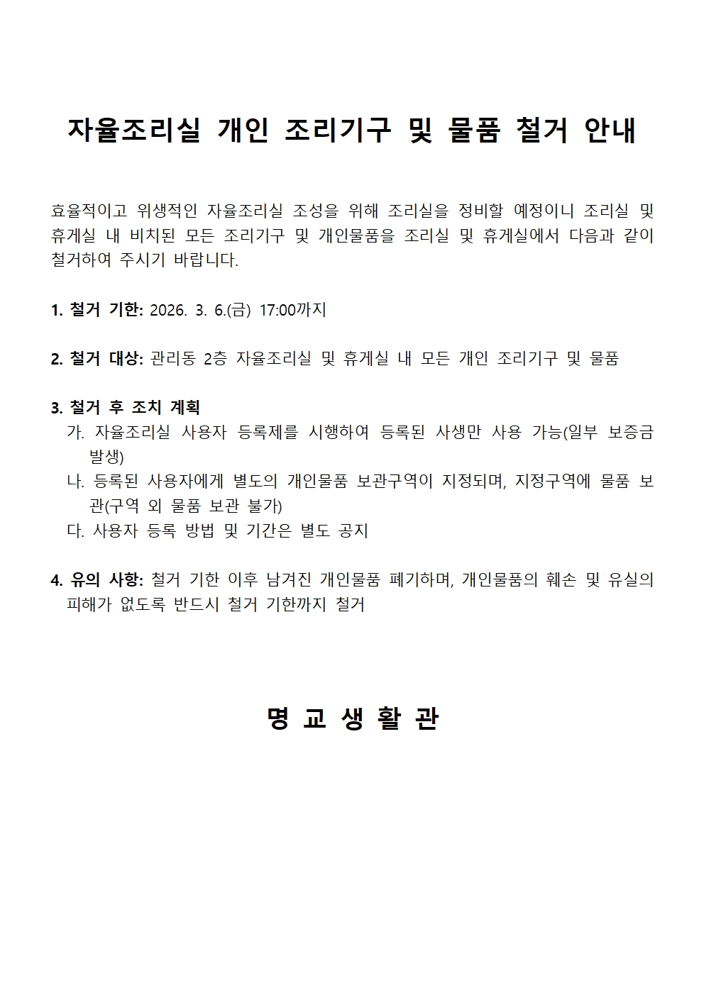 자율조리실 조리기구 및 개인물품 철거 안내
