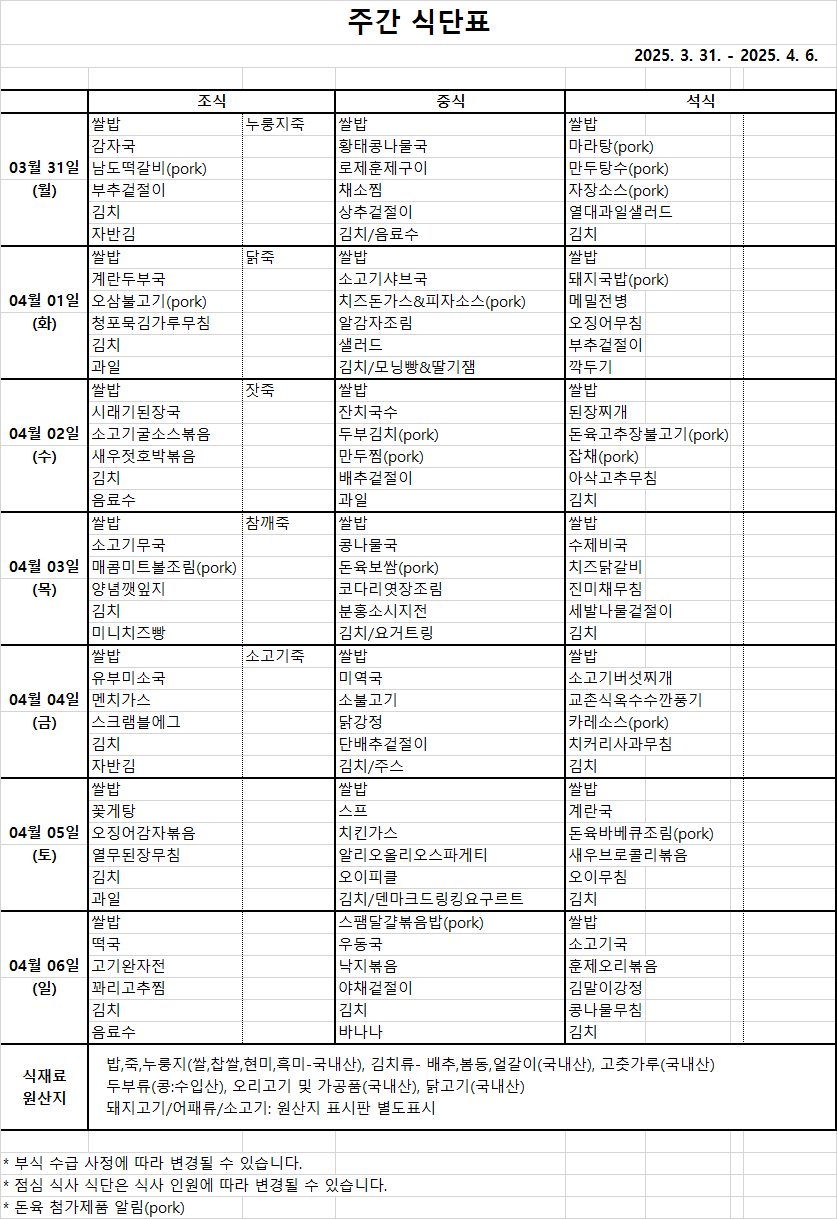주간 식단표[2025. 03. 31. ~ 2025. 04. 06.]